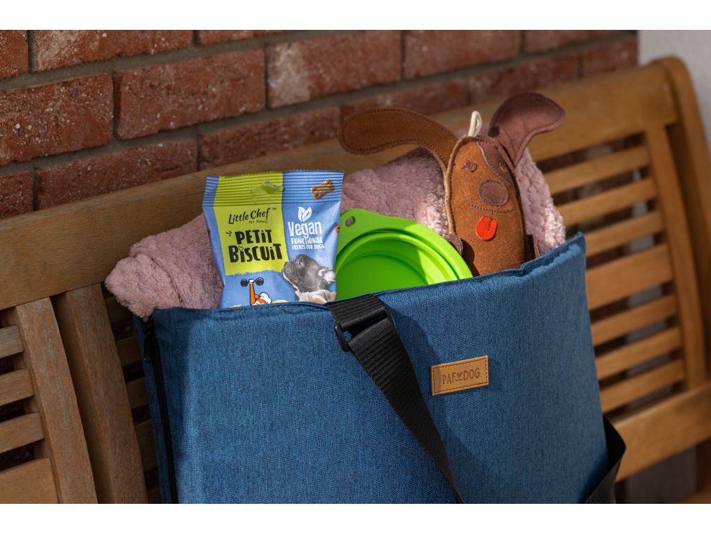 Součástí je nastavitelný popruh, který umožňuje pohodlné nošení přes rameno nebo cross-body. Do tašky se pohodlně vejdou i drobnosti pro vašeho pejska – jídlo, pamlsky, vodítko, deka nebo miska a lahev na vodu.