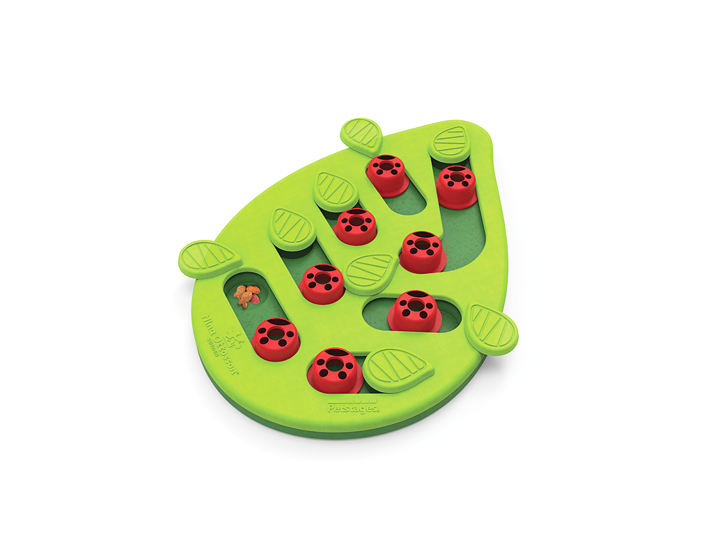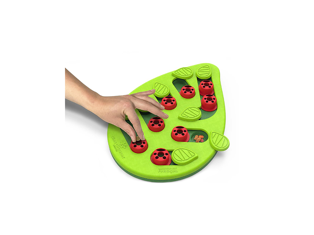 Ukryjte pamlsky nebo oblíbené granulky pod zelené lístečky nebo pod beruškové kolíčky (pamlsek vhoďte dovnitř ovorem) a připravte své kočce dlouhotrvající zábavu. Pamlsky lze jednoduše získat posunutím lístečku, složitější hru pak nabízí beruškové kolíčky, které je třeba posunout na místo lístečku, pamlsek se dostane do prohlubně. Když kočka odsune kolíček drážkou zpět, získá svou mlsnou odměnu.