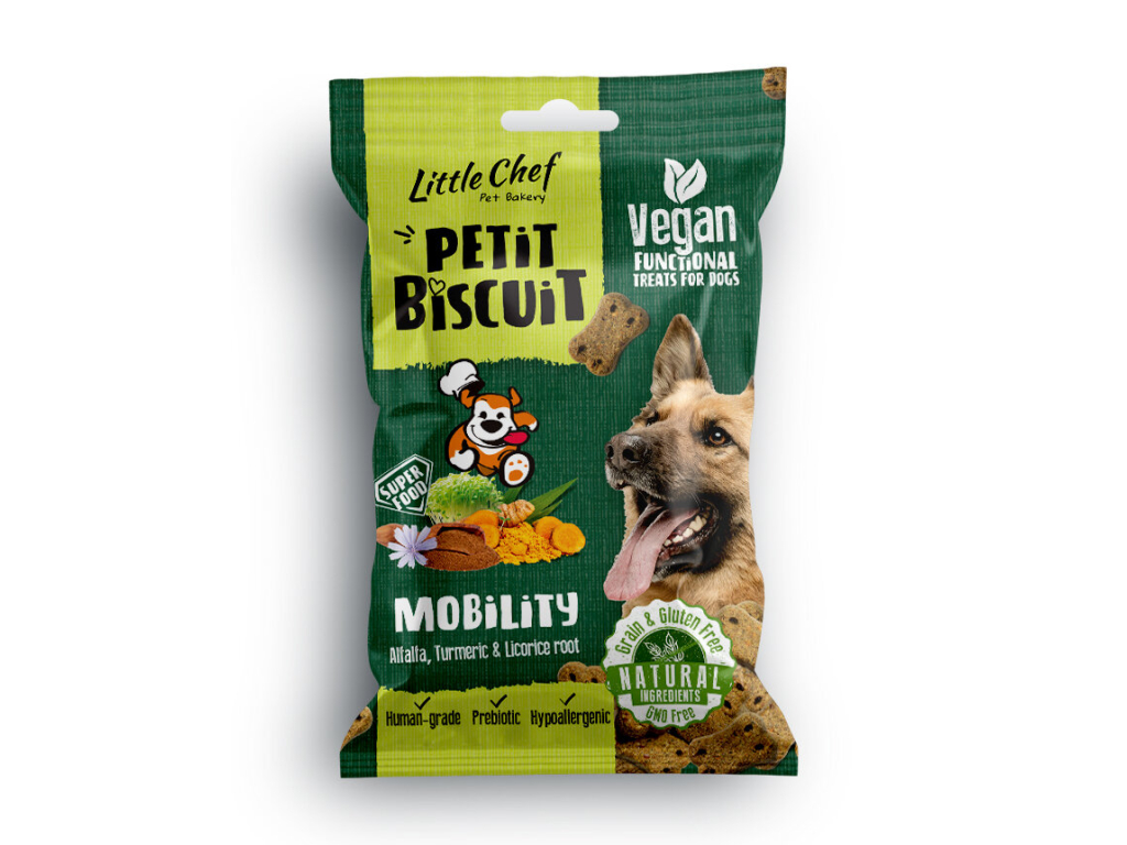 Petit Biscuit sú funkčné maškrty pečené v malých dávkach z čisto vegánskych ingrediencií v potravinárskej kvalite. Receptúra Mobility s lucernou, kurkumou a koreňom sladkého drievka prirodzene podporuje zdravie pohybového aparátu psa a prispieva k celkovej vitalite.