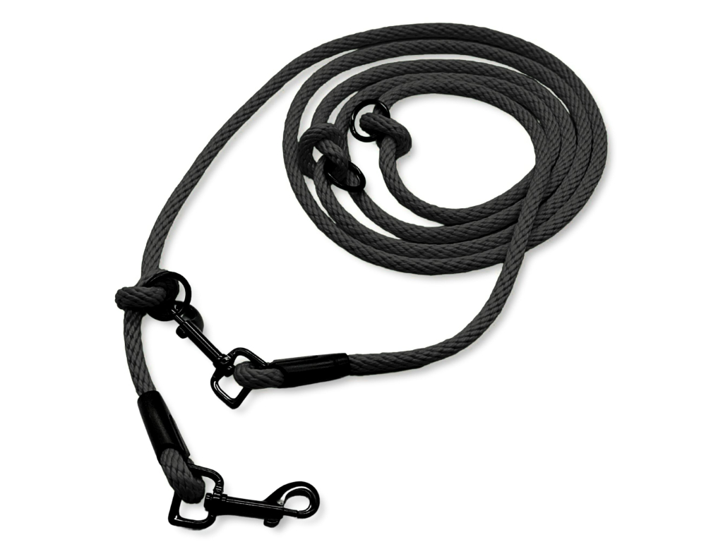 Vďaka uzlom môžete vytvoriť zarážku pre každý z 3 kovových krúžkov, čo vám umožní maximálne prispôsobenie vodítka. Je to veľmi jednoduchý systém, ale je praktický a vodítko je vďaka nemu naozaj variabilné. Veľmi obľúbené je nosiť vodítko okolo tela cez rameno (krížom cez telo) a okolo pása, keď máte voľné ruky a pes je pod kontrolou. Vodítko môžete tiež skrátiť na polovicu priviazaním krúžku k obojku alebo vytvorením ručnej slučky. Možností je množstvo.
