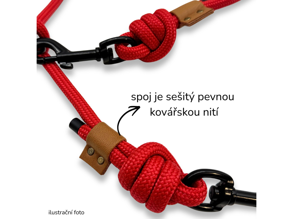 Na vodítku nájdete tri kovové krúžky, ktoré si každý sám jednoducho upevní pomocou uzla presne tam, kde mu to najviac vyhovuje. Vďaka tomuto systému si môžete vodítko prispôsobiť podľa svojich potrieb aj štýlu venčenia – krúžok ľahko posuniete a zaistíte jednoduchým uzlom, bez nutnosti špeciálnych nástrojov.