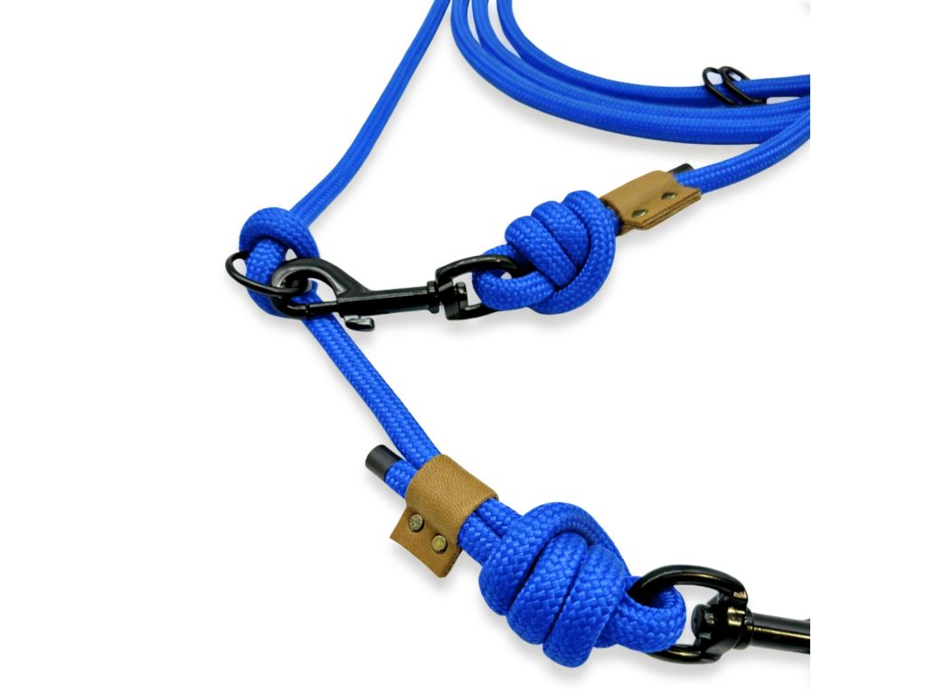 Na vodítku najdete tři kovové kroužky, které si každý sám jednoduše upevní pomocí uzlu přesně tam, kde mu to nejvíce vyhovuje. Díky tomuto systému si můžete vodítko přizpůsobit podle svých potřeb i stylu venčení – kroužek snadno posunete a zajistíte jednoduchým uzlem, bez nutnosti speciálních nástrojů.