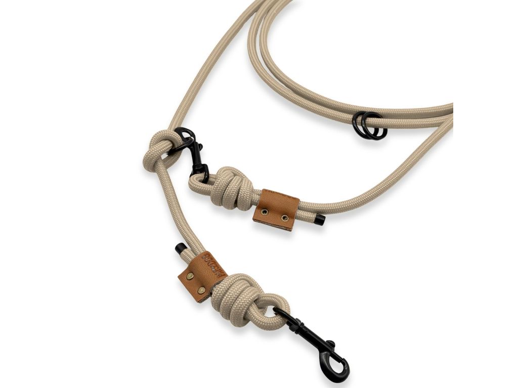 Na vodítku najdete tři kovové kroužky, které si každý sám jednoduše upevní pomocí uzlu přesně tam, kde mu to nejvíce vyhovuje. Díky tomuto systému si můžete vodítko přizpůsobit podle svých potřeb i stylu venčení – kroužek snadno posunete a zajistíte jednoduchým uzlem, bez nutnosti speciálních nástrojů.