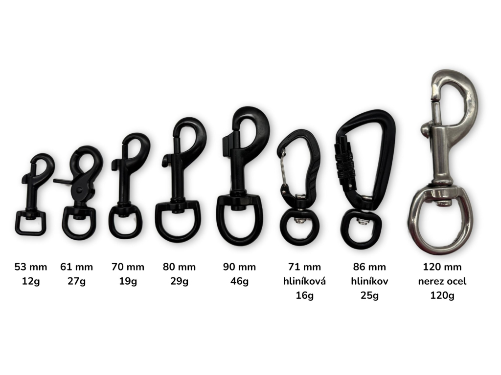 Na vodítko standardně dáváme karabinu o velikosti 70 mm. Můžete si však zvolit i jinou velikost a typ karabiny (viz nabídka VELIKOST KARABINY).
