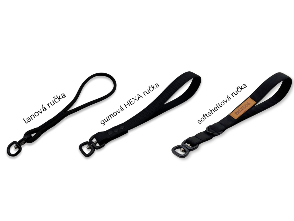 Součástí vodítka je ručka (poutko na ruku) o délce cca 30 cm, od které můžete jednotlivá vodítka odepnout. Můžete si vybrat buď lanovou, gumovou hexa nebo softshellovou ručku.